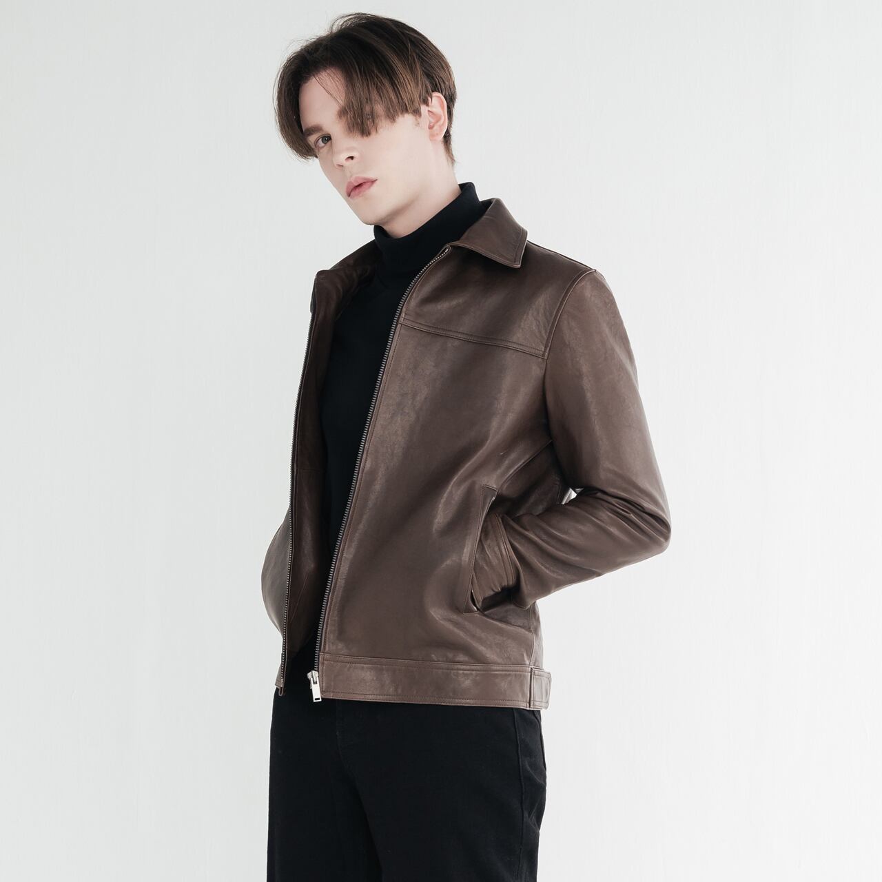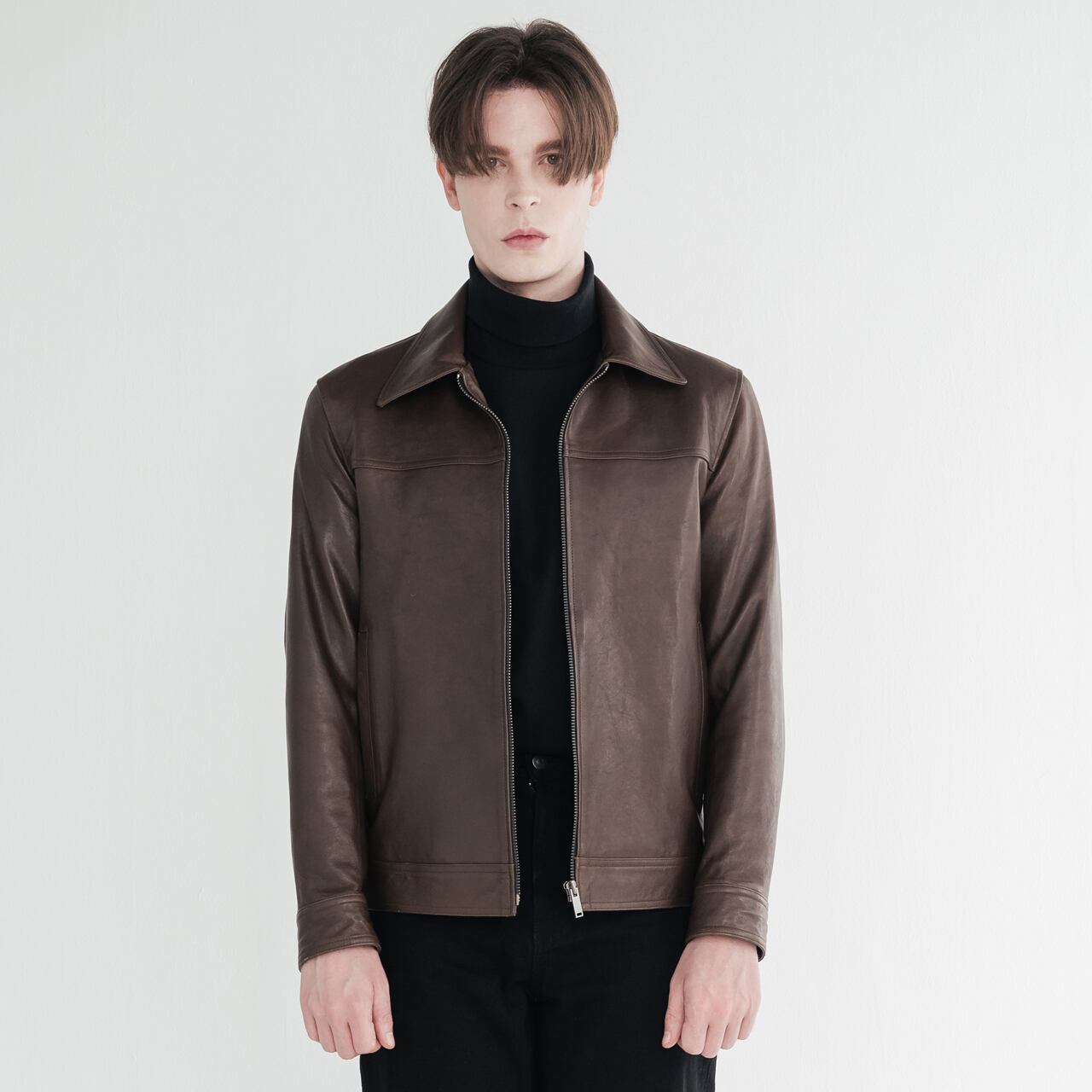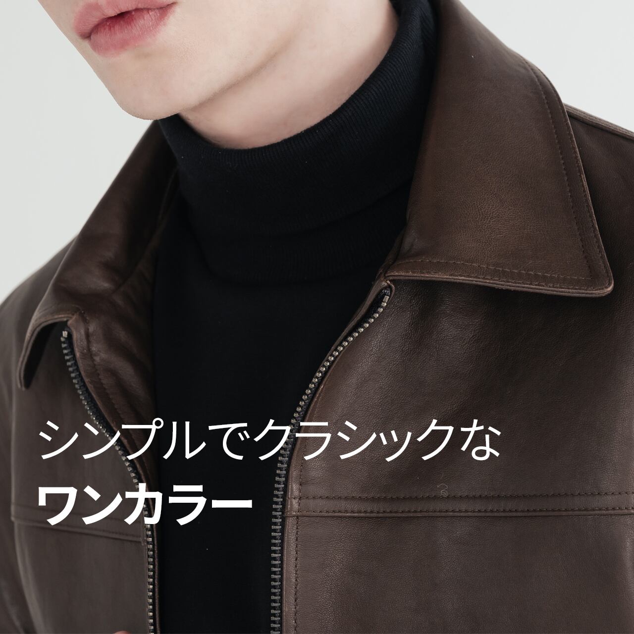 -シンプルなインナーと合わせて、レザーの質感を活かした着こなしを。