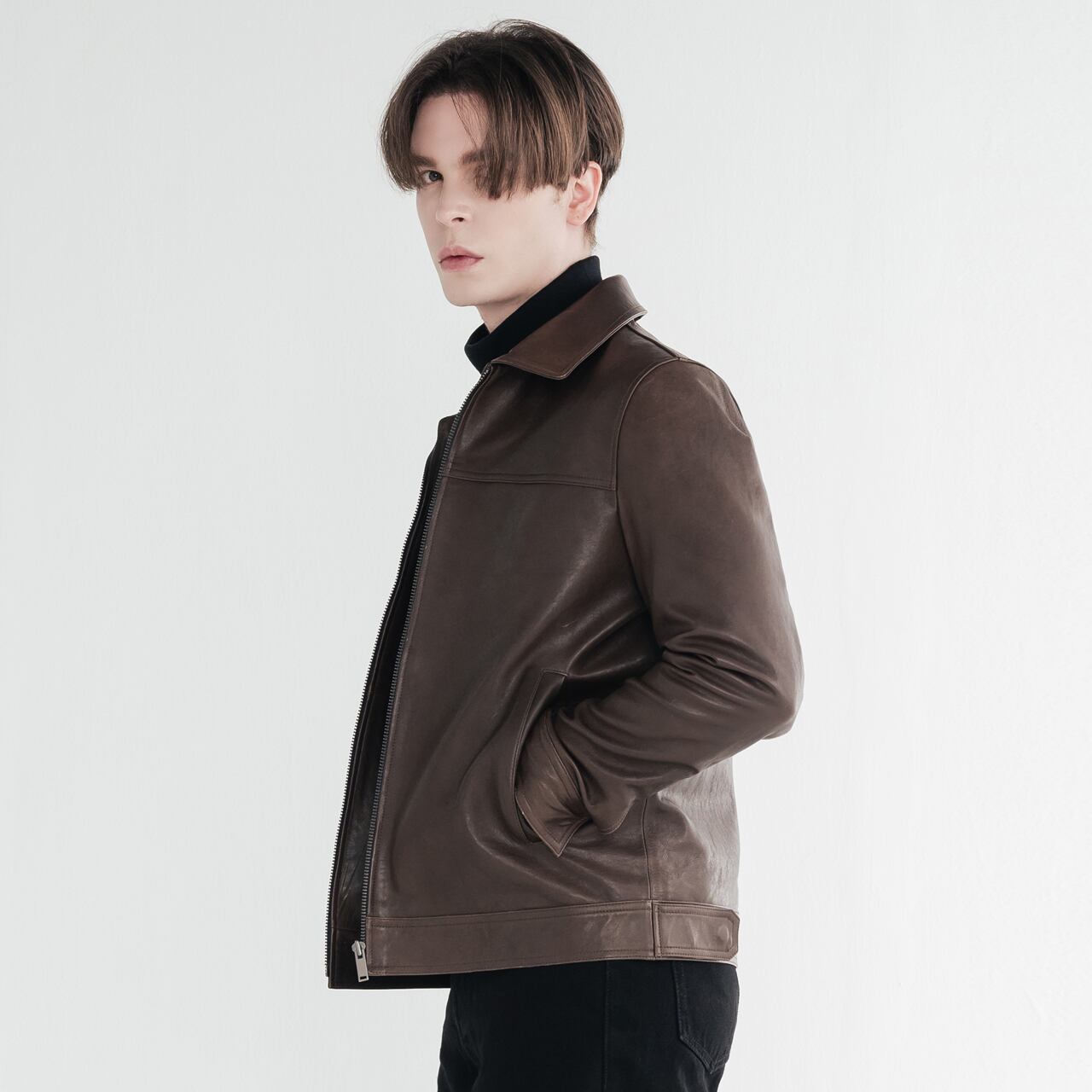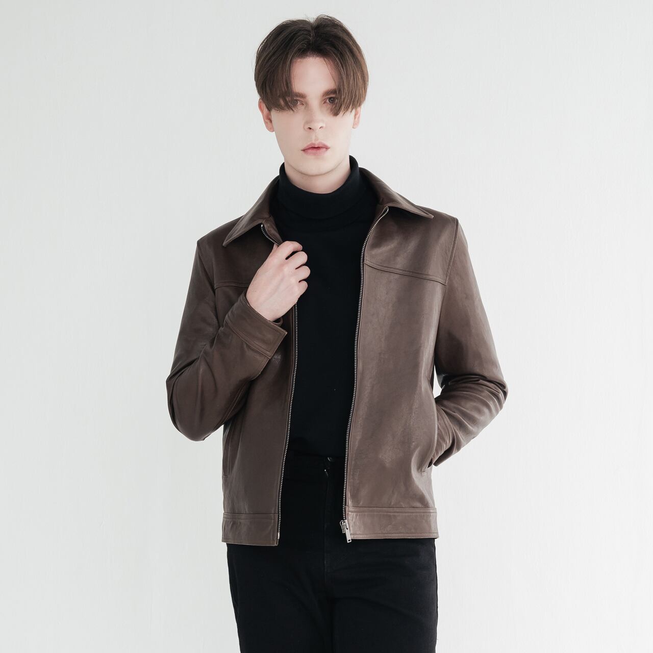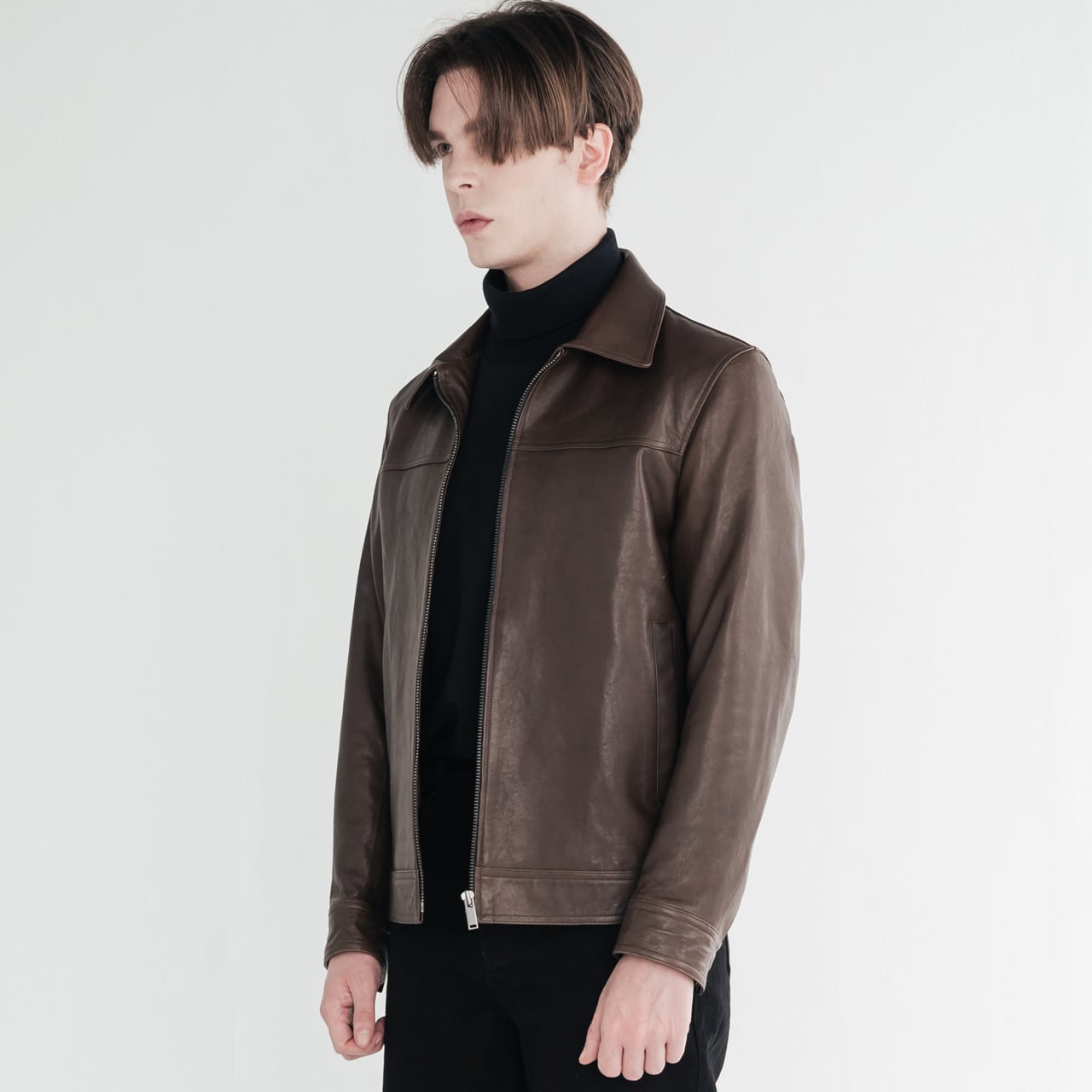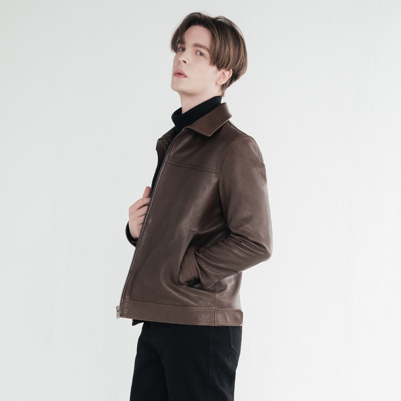 -シンプルなインナーと合わせて、レザーの質感を活かした着こなしを。