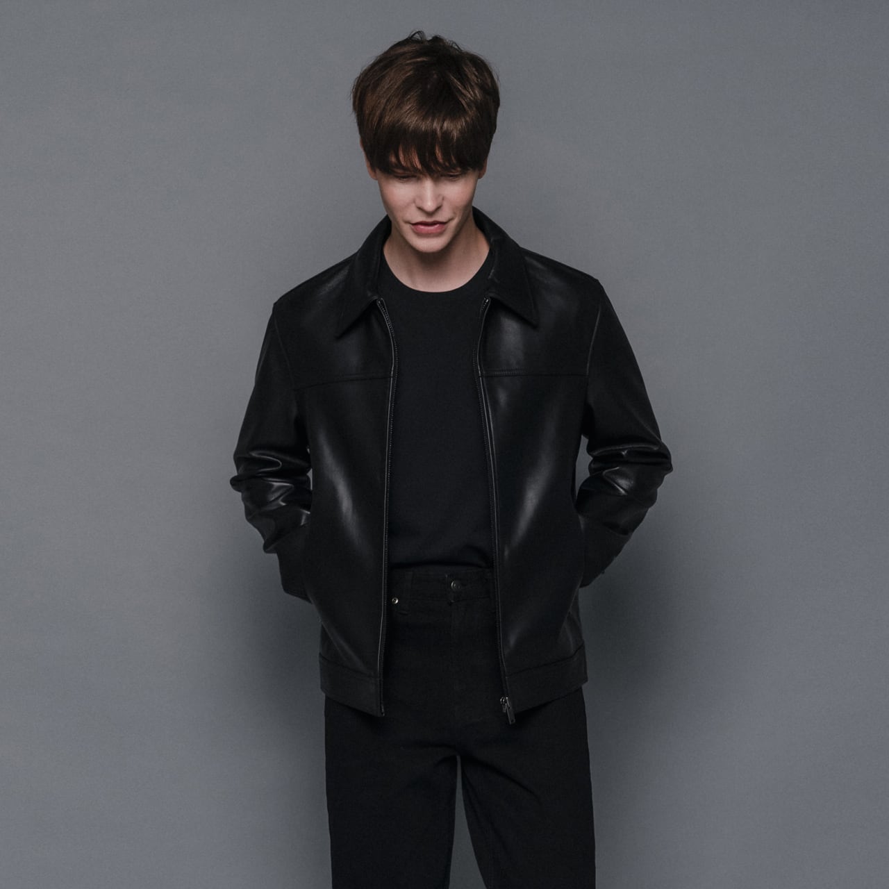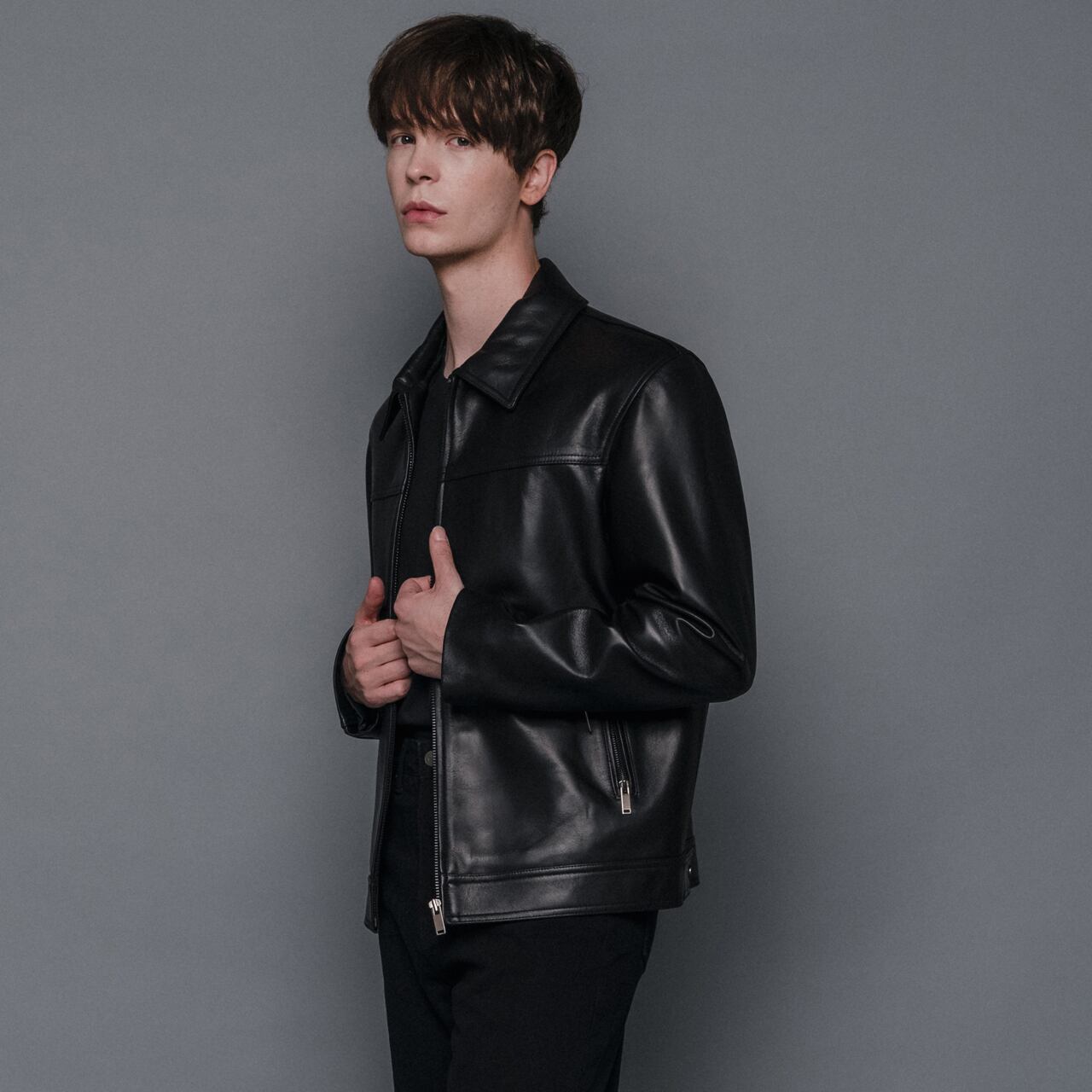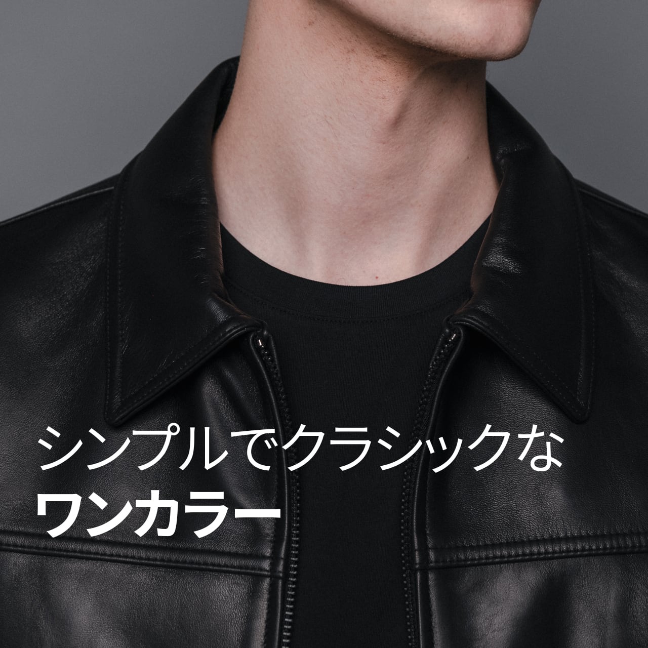 -シンプルなインナーと合わせて、レザーの質感を活かした着こなしを。