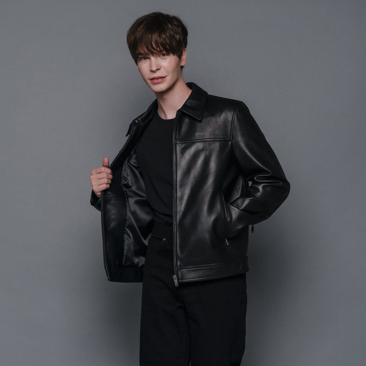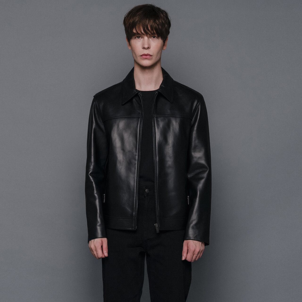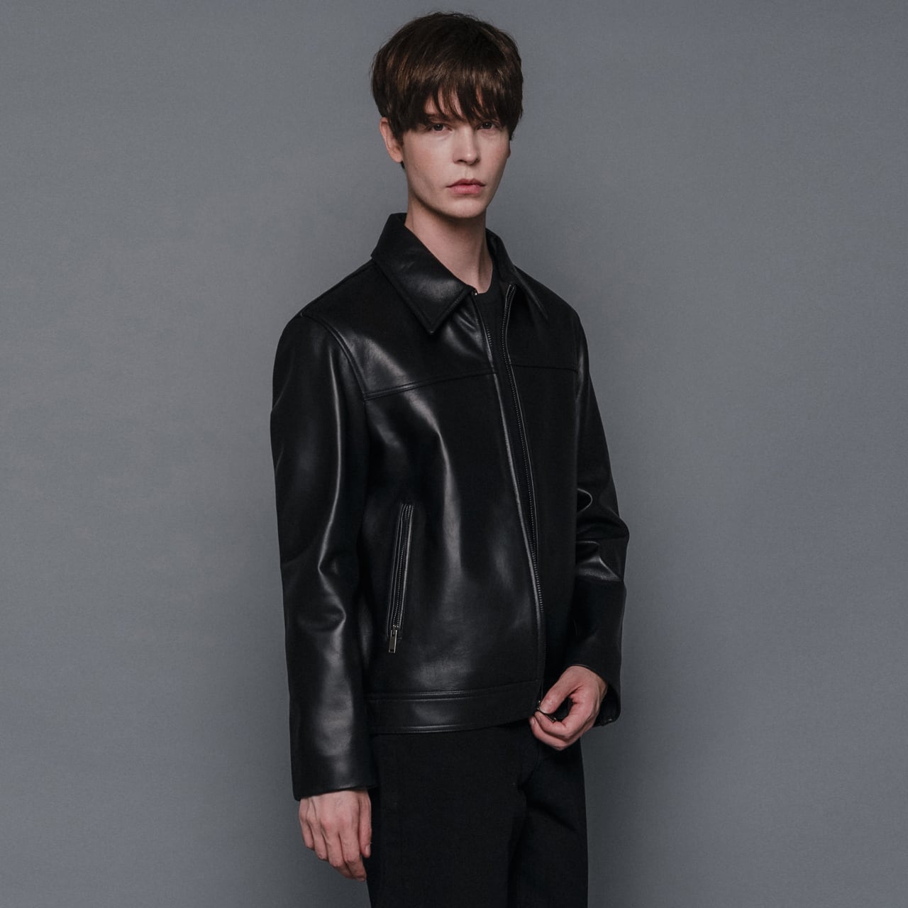 -シンプルなインナーと合わせて、レザーの質感を活かした着こなしを。