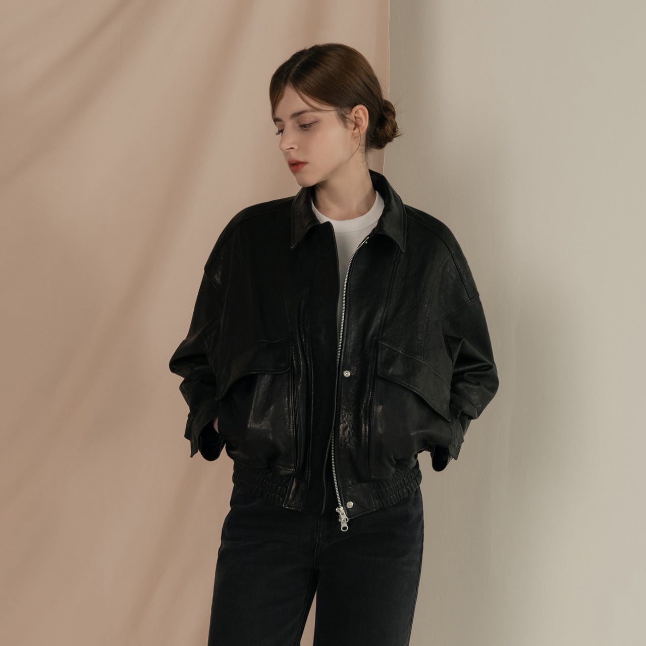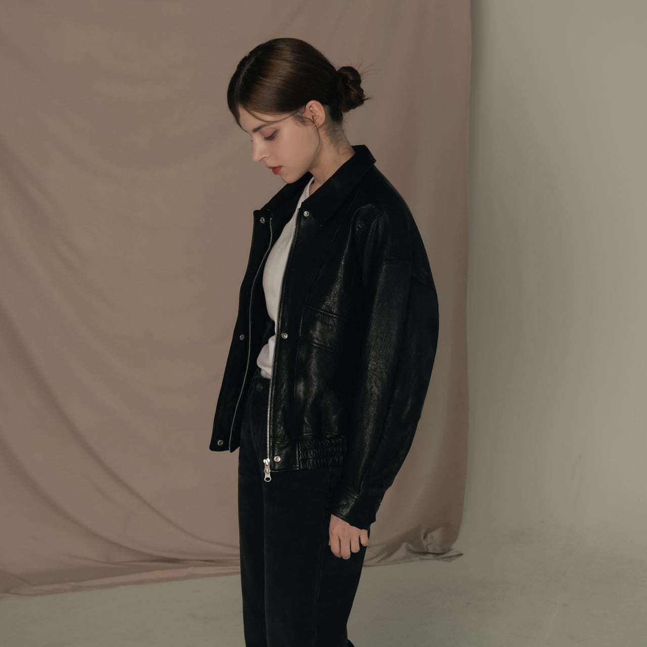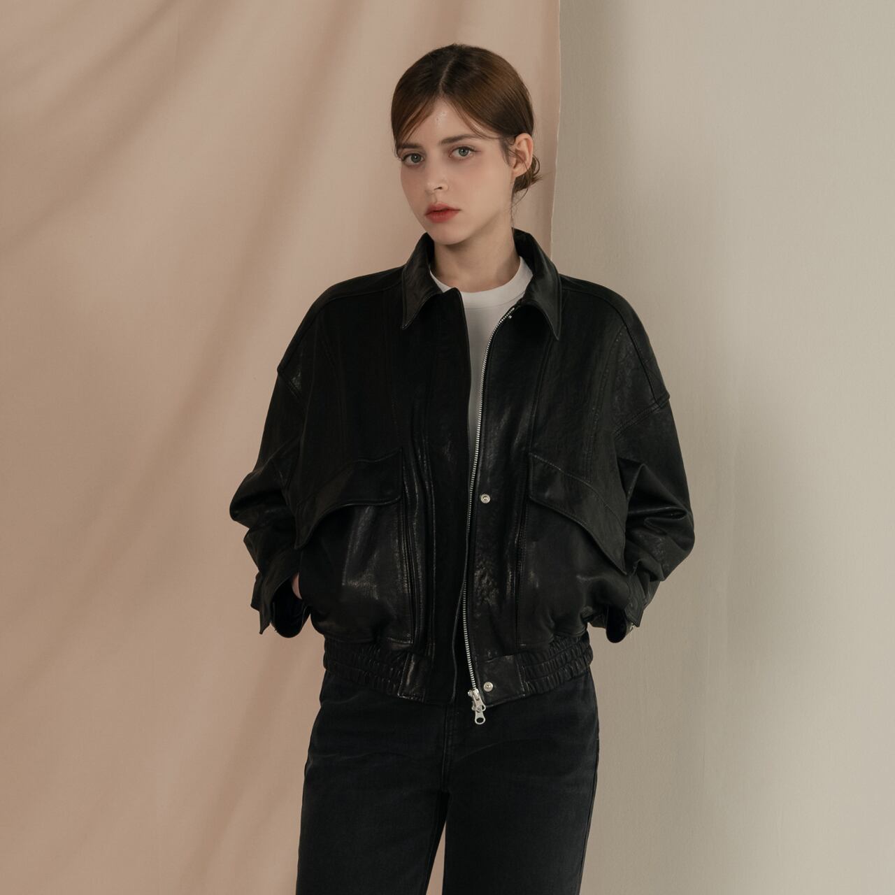 -シンプルなインナーと合わせて、レザーの質感を活かした着こなしを。