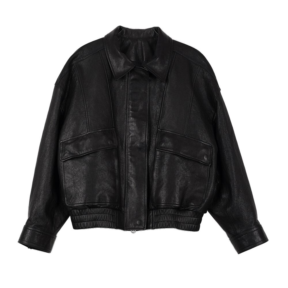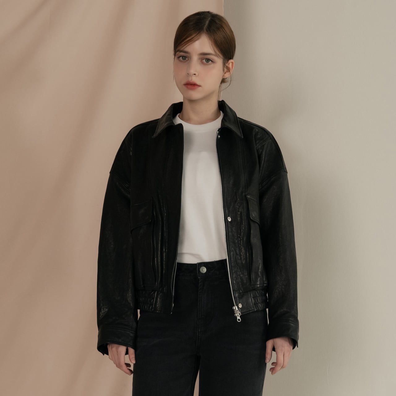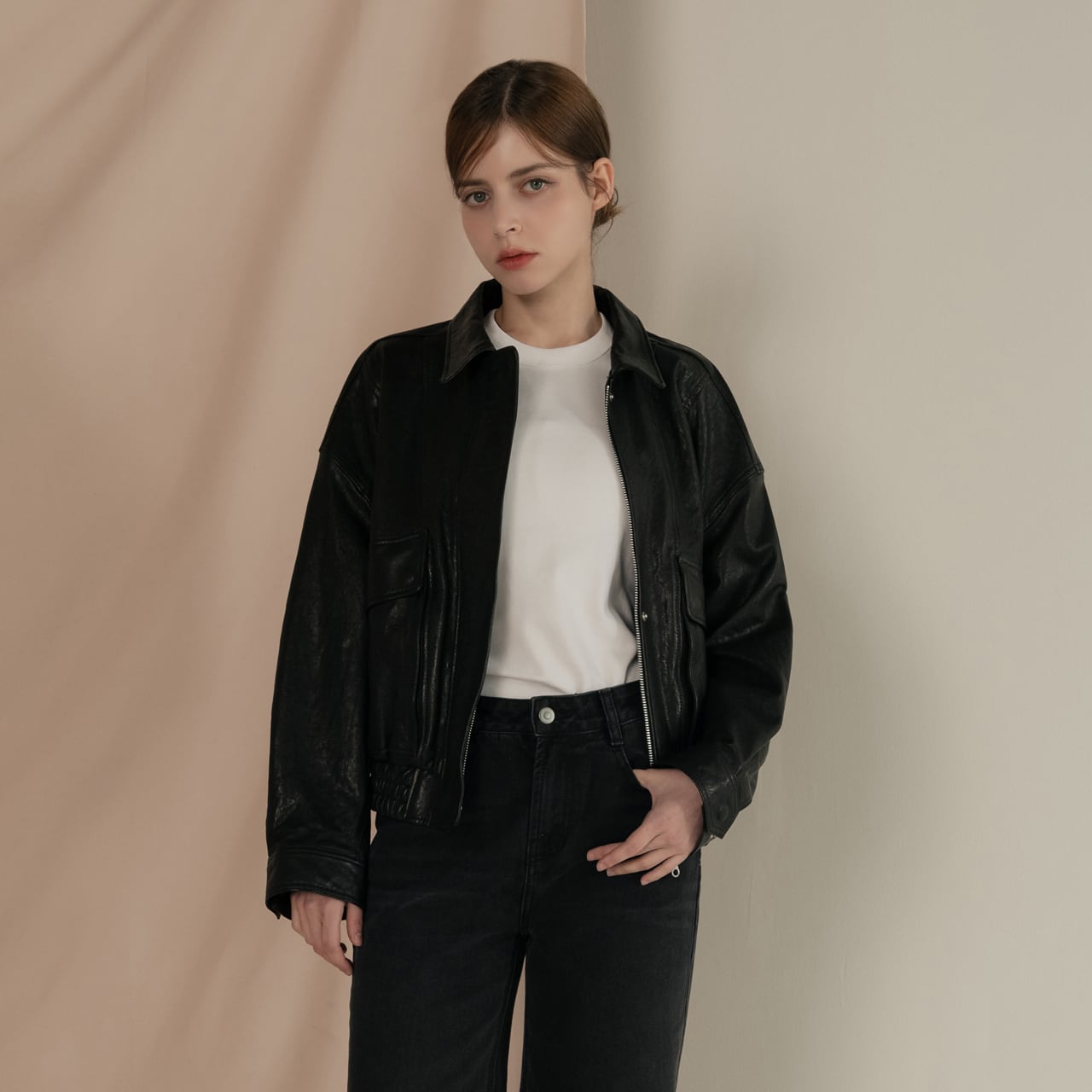 -シンプルなインナーと合わせて、レザーの質感を活かした着こなしを。